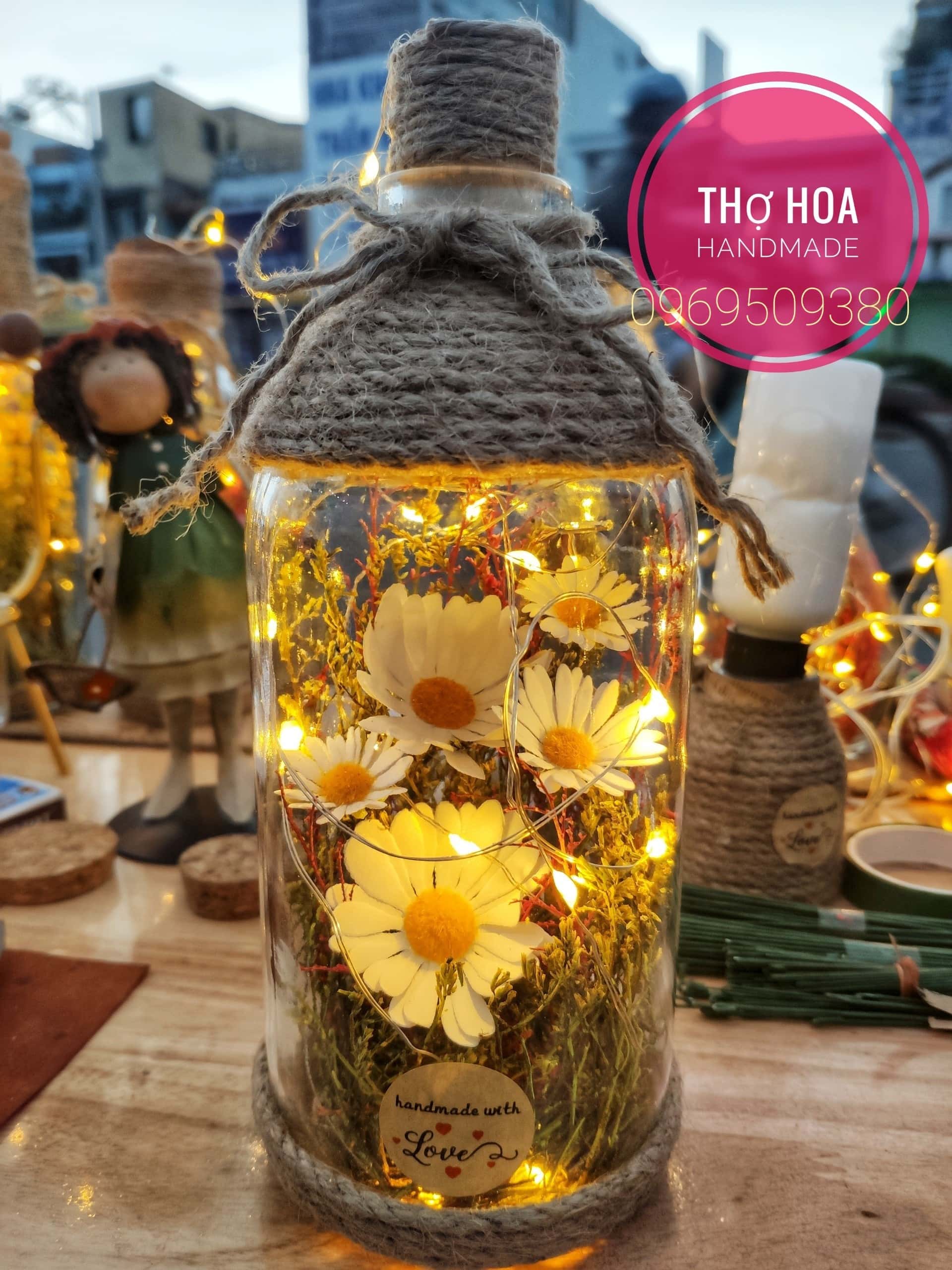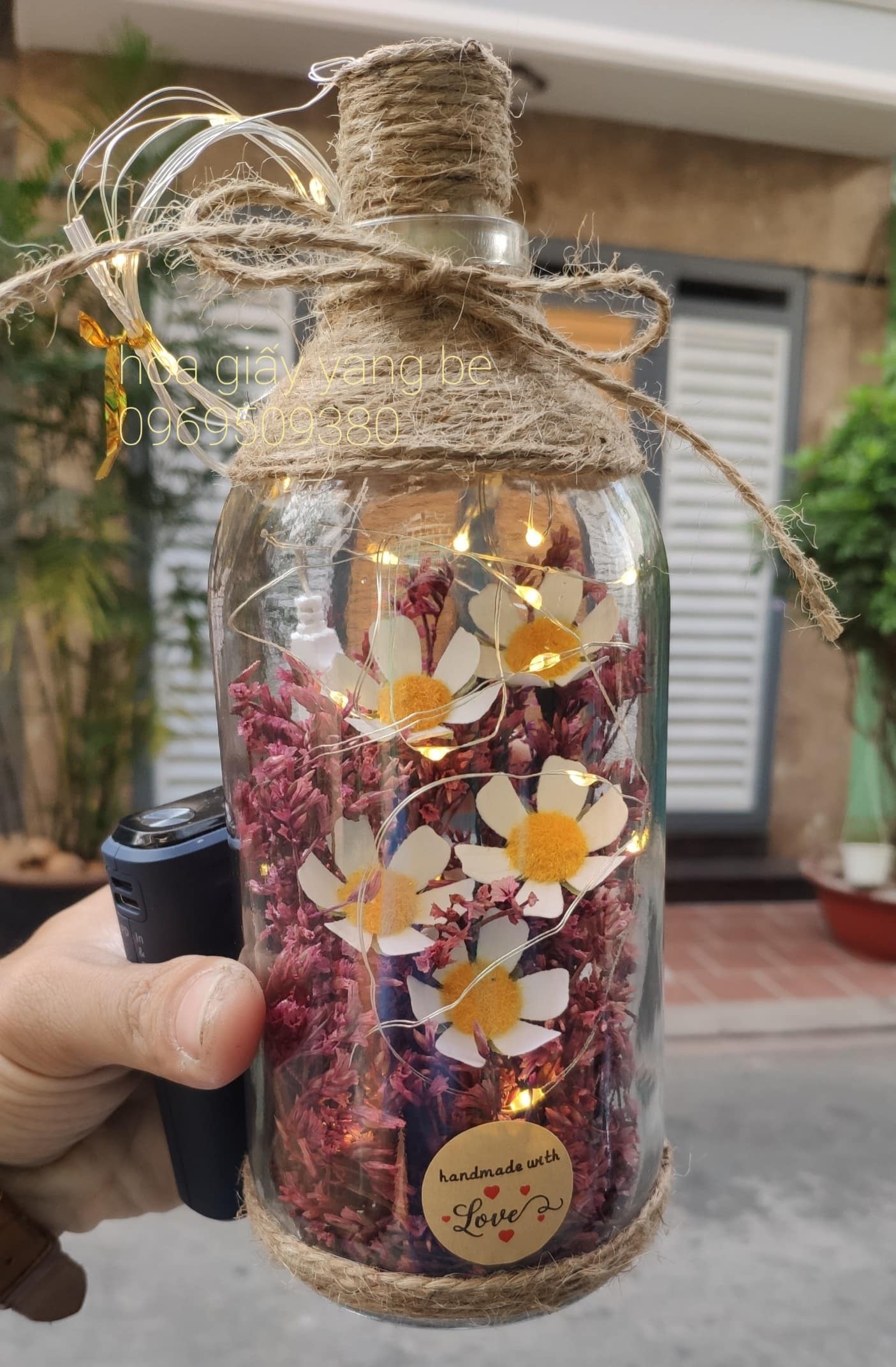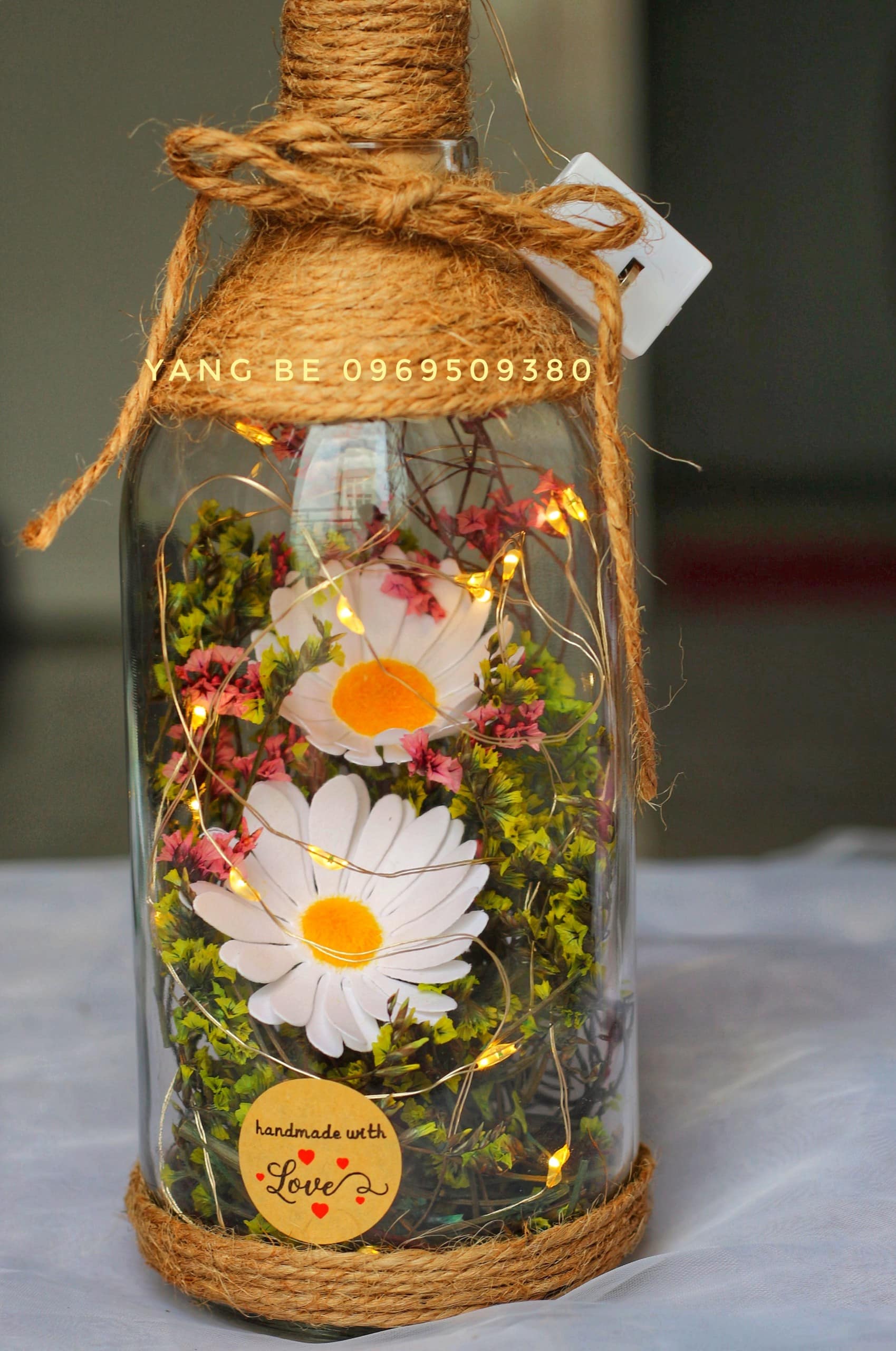 Cách thức: Lọ thủy tinh khoảng 300ml dẹp được quấn dây thừng , nút gỗ ép có lỗ dẫn dây đèn nhiều bóng đèn nhỏ bên trong.