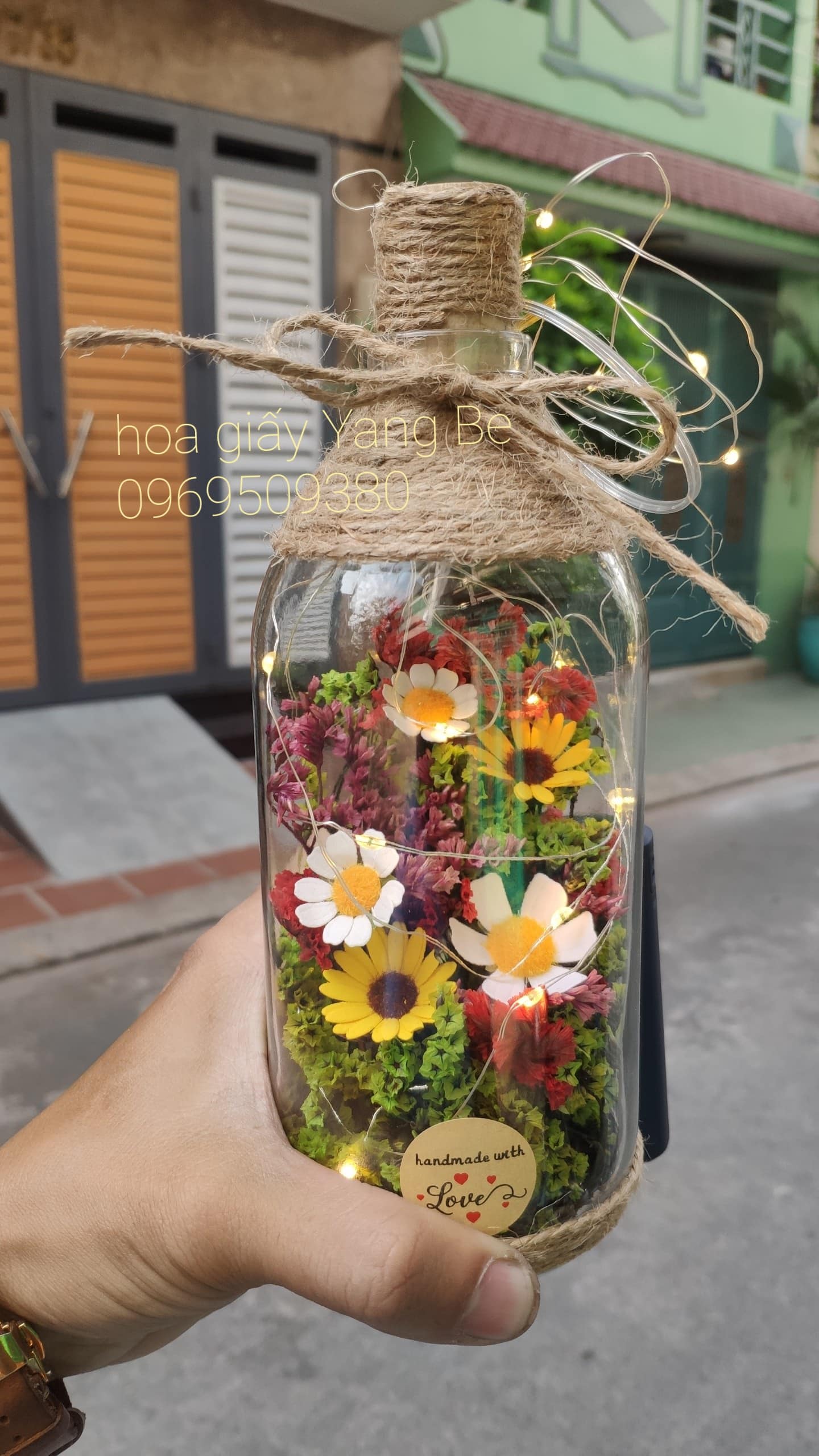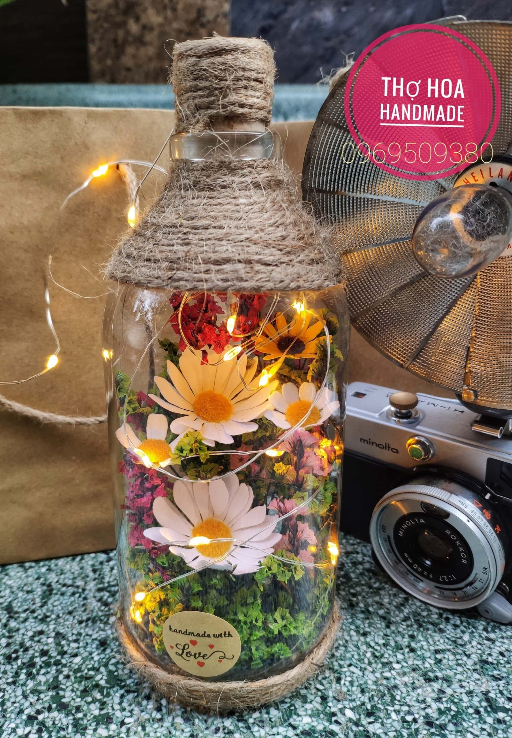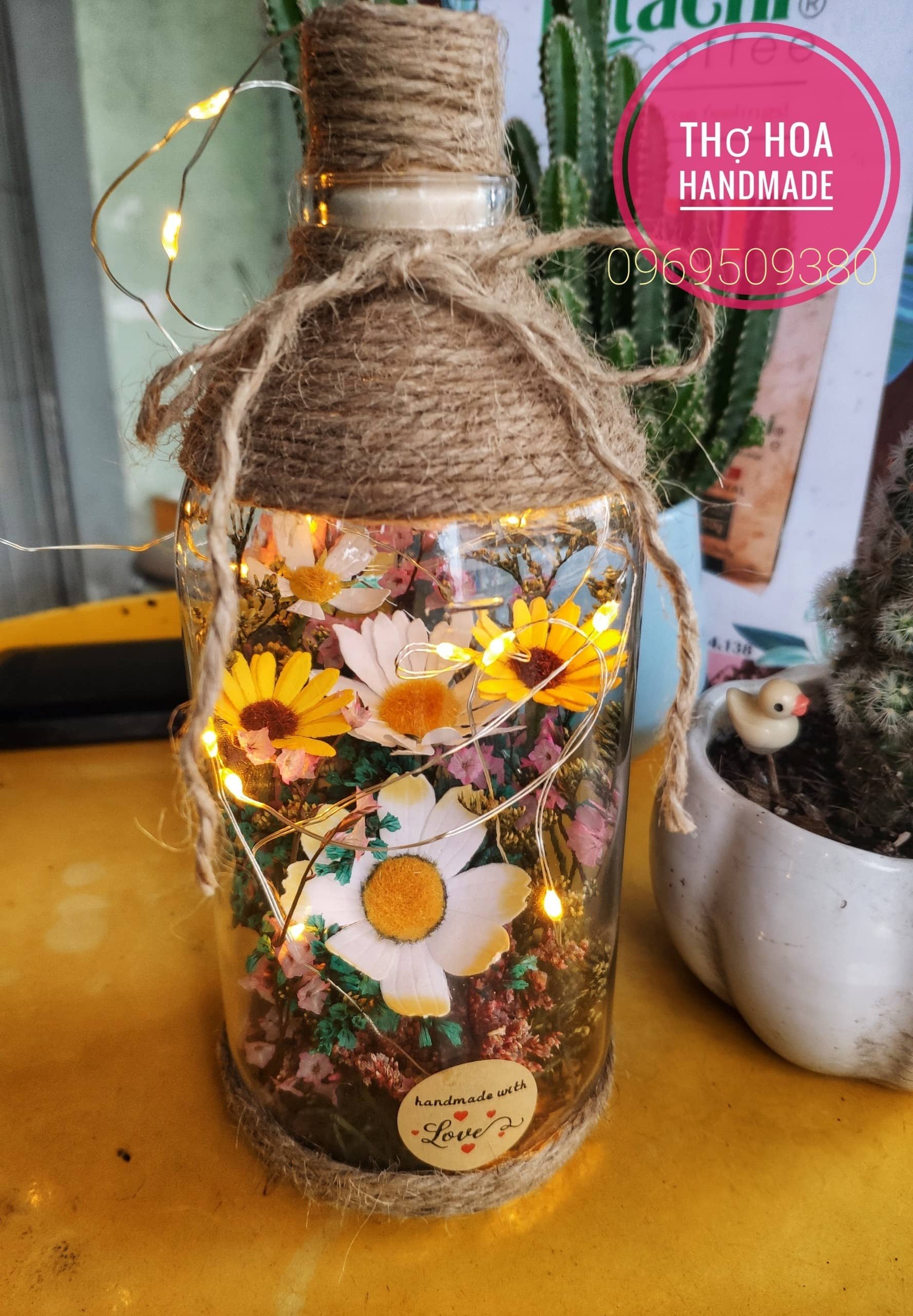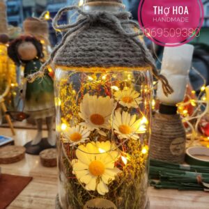 Cách thức: Lọ thủy tinh khoảng 300ml dẹp được quấn dây thừng , nút gỗ ép có lỗ dẫn dây đèn nhiều bóng đèn nhỏ bên trong.